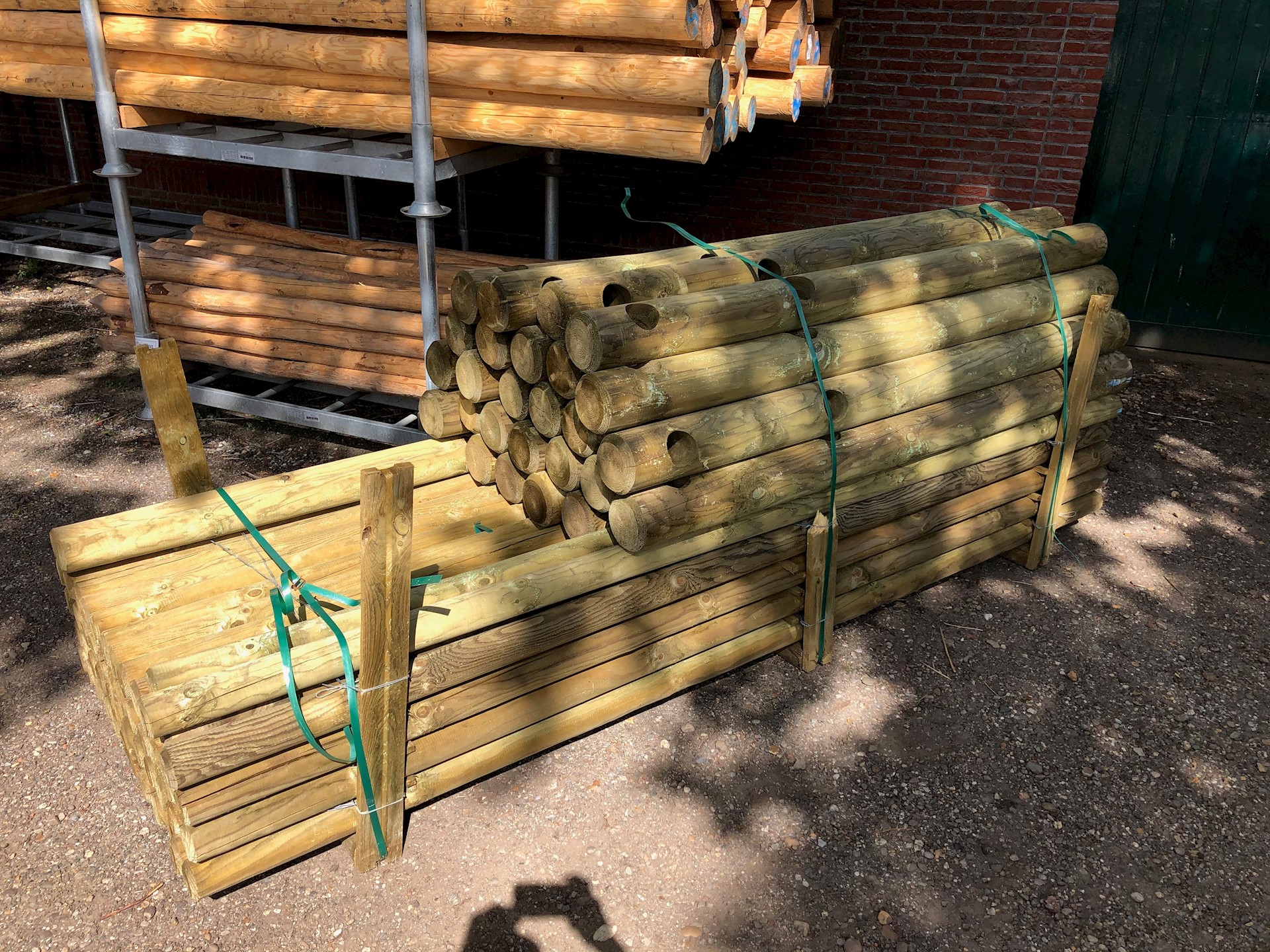 | Liggers | Ø8 cm | 3 meter lang | Grenen | Gefreesd, groen geïmpregneerd | €11,50 |